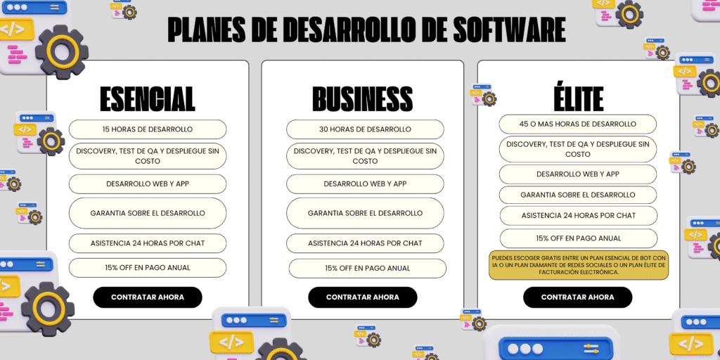 - Puedes escoger gratis entre un plan Esencial de Bot con IA, un plan Diamante de redes sociales o un plan Élite de facturación electrónica.